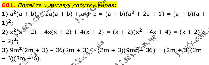 Подайте у вигляді добутку вираз: 1) а2(а + b) + 2а(а + b) + а + b = (a + b)(a2 + 2a + 1) = (a + b)(a + 1)2; 2) x2(x + 2) – 4x(x + 2) + 4(x + 2) = (x + 2)(x2 – 4x + 4) = (x + 2)(x – 2)2; 3) 9m2(2m + 3) – 36(2m + 3) = (2m + 3)(9m2 – 36) = (2m + 3)(3m – 6)(3m + 6).