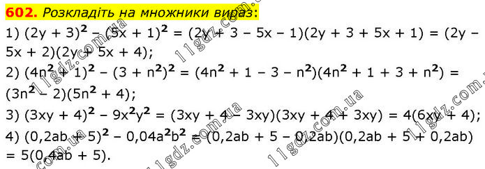 Розкладіть на множники вираз: 1) (2у + З)2 – (5x + 1)2 = (2y + 3 – 5x – 1)(2y + 3 + 5x + 1) = (2y – 5x + 2)(2y + 5x + 4); 2) (4n2 + 1)2 – (3 + n2)2 = (4n2 + 1 – 3 – n2)(4n2 + 1 + 3 + n2) = (3n2 – 2)(5n2 + 4); 3) (Зху + 4)2 – 9х2у2 = (3xy + 4 – 3xy)(3xy + 4 + 3xy) = 4(6xy + 4); 4) (0,2аb + 5)2 – 0,04а2b2 = (0,2ab + 5 – 0,2ab)(0,2ab + 5 + 0,2ab) = 5(0,4ab + 5).