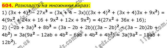 Розкладіть на множники вираз: 1) (Зх + 4)3 – 27х3 = (3x + 4 – 3x)((3x + 4)2 + (3x + 4)3x + 9x2) = 4(9x2 + 24x + 16 + 9x2 + 12x + 9x2) = 4(27x2 + 36x + 16); 2) (–2b + За)3 + 8b3 = (3a – 2b + 2b)((3a – 2b)2 – (3a – 2b)2b + 4b2) = 3a(9a2 – 12ab + 4b2 – 6ab + 4b2 + 4b2) = 3a(9a2 – 18ab + 12b2).