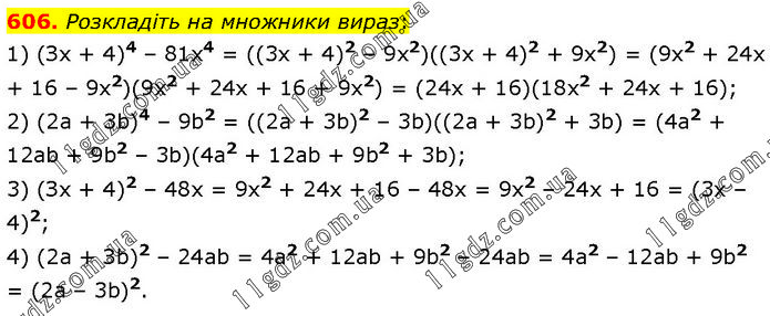 Розкладіть на множники вираз: 1) (Зх + 4)4 – 81х4 = ((3x + 4)2 – 9x2)((3x + 4)2 + 9x2) = (9x2 + 24x + 16 – 9x2)(9x2 + 24x + 16 + 9x2) = (24x + 16)(18x2 + 24x + 16); 2) (2а + 3b)4 – 9b2 = ((2a + 3b)2 – 3b)((2a + 3b)2 + 3b) = (4a2 + 12ab + 9b2 – 3b)(4a2 + 12ab + 9b2 + 3b); 3) (Зх + 4)2 – 48х = 9x2 + 24x + 16 – 48x = 9x2 – 24x + 16 = (3x – 4)2; 4) (2а + Зb)2 – 24аb = 4a2 + 12ab + 9b2 – 24ab = 4a2 – 12ab + 9b2 = (2a – 3b)2.
