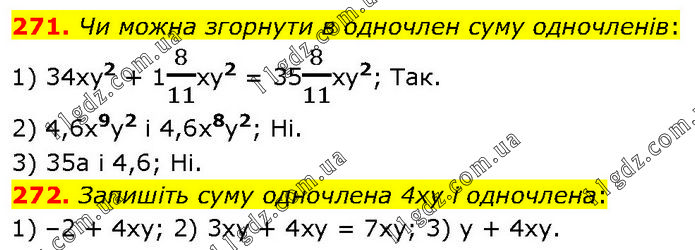 271. Чи можна згорнути в одночлен суму одночленів: 1) 34xy2 + 18/11xy2 = 358/11xy2; Так. 2) 4,6х9у2 і 4,6x8y2; Ні. 3) 35а і 4,6; Ні. 272. Запишіть суму одночлена 4xy і одночлена: 1) –2 + 4ху; 2) 3ху + 4ху = 7ху; 3) у + 4ху.