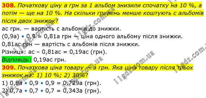 308. Початкову ціну а грн за 1 альбом знизили спочатку на 10 %, а потім — ще на 10 %. На скільки гривень менше коштують с альбомів після двох знижок? ас грн. — вартість c альбомів до знижки. (0,9a) • 0,9 = 0,81a грн — ціна одного альбому після знижки. 0,81ас грн — вартість с альбомів після знижки. Різниця: ас – 0,81ас = 0,19ас (грн). Відповідь: 0,19ас грн. 309. Початкова ціна товару — а грн. Яка ціна товару після трьох знижок на: 1) 10 %; 2) 30%? 1) 0,9a • 0,9 • 0,9 = 0,729а (грн). 2) 0,7а • 0,7 • 0,7 = 0,343а (грн).
