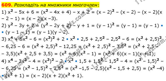 Розкладіть на множники многочлен: 1) x2 – 5x + 6 = (x2 – 4x + 4) – x + 2 = (x – 2)2 – (x – 2) – (x – 2)(x – 2 – 1) = (x – 2)(x –3). 2) y2 – 3y + 2 = (y2 – 2y + 2) – у + 1 = (у – 1)2 = (у – 1) = (у – 1) • (y – 1 – 1) = (у – 1)(y – 2). 3) x4 + 5x2 – 6 = (x2)2 + 2 • x2 • 2,5 + 2,52 – 2,52 – 6 = (x2 + 2,5)2 – 6,25 – 6 = (х2 + 2,5)2 – 12,25 = (х2 + 2 ,5)2 – 3,52 = (х2 + 2,5 – 3,5)(x2 + 2,5 + 3,5) = (х2 + 6)(x2 – 1) = (х2 + 6)(х – 1)(x + 1); 4) x4 – Зх2 – 4 = (x2)2 – 2 • x2 • 1,5 + 1,52 – 1,52 – 4 = (х2 – 1,5)2 – – 6,25 = (х2 – 1,5)2 – 2,52 = (х2 –1,5 – 2,5)(x2 – 1,5 + 2,5) = (х2 –4) • (х2 + 1) = (х – 2)(х + 2)(х2 + 1).