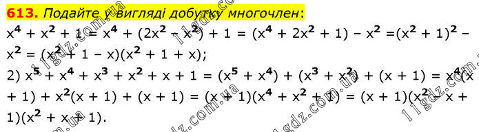 Подайте у вигляді добутку многочлен: 1) x4 + x2 + 1 = x4 + (2x2 – x2) + 1 = (x4 + 2x2 + 1) – x2 =(x2 + 1)2 – x2 = (x2 + 1 – x)(x2 + 1 + x); 2) x5 + x4 + x3 + x2 + x + 1 = (x5 + x4) + (х3 + x2) + (x + 1) = x4(x + 1) + x2(x + 1) + (x + 1) = (x + 1)(x4 + x2 + 1) = (x + 1)(x2 – x + 1)(x2 + x + 1).