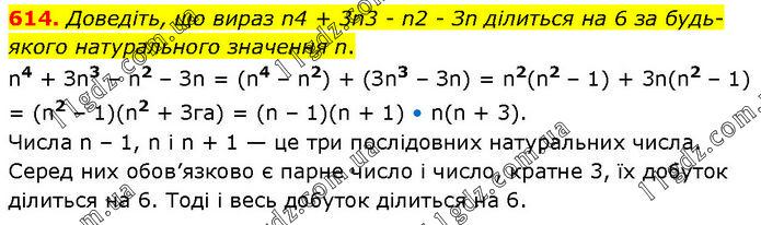 Доведіть, що вираз n4 + 3n3 - n2 - Зn ділиться на 6 за будь-якого натурального значення n. n4 + Зn3 – n2 – Зn = (n4 – n2) + (Зn3 – Зn) = n2(n2 – 1) + 3n(n2 – 1) = (n2 – 1)(n2 + Зn) = (n – 1)(n + 1) • n(n + 3). Числа n – 1, n і n + 1 — це три послідовних натуральних числа. Серед них обов’язково є парне число і число, кратне 3, їх добуток ділиться на 6. Тоді і весь добуток ділиться на 6.