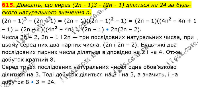 Доведіть, що вираз (2n - 1)3 - (2n - 1) ділиться на 24 за будь-якого натурального значення n. (2n – 1)3 – (2n – 1) = (2n – 1)((2n – 1)2 – 1) = (2n – 1)((4n2 – 4n + 1 – 1) = (2n – 1)((4n2 – 4n) = (2n – 1) • 2n(2n – 2). Числа 2n – 2, 2n – 1 і 2n — три послідовних натуральних числа, при цьому серед них два парних числа. (2n і 2n – 2). Будь–які два послідовних парних числа діляться відповідно на 2 і на 4. Отже, добуток кратний 8. Серед трьох послідовних натуральних чисел одне обов’язково ділиться на 3. Тоді добуток ділиться на 8 і на 3, а значить, і на добуток 8 • 3 = 24.