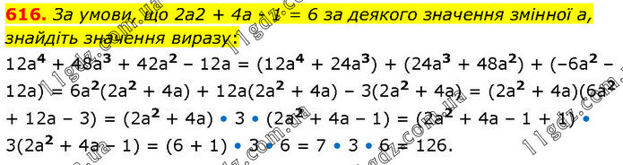 За умови, що 2а2 + 4а - 1 = 6 за деякого значення змінної а, знайдіть значення виразу: 12а4 + 48а3 + 42а2 – 12а = (12а4 + 24а3) + (24а3 + 48а2) + (–6а2 – 12а) = 6а2(2а2 + 4а) + 12а(2а2 + 4а) – 3(2а2 + 4а) = (2а2 + 4а)(6а2 + 12а – 3) = (2а2 + 4а) • 3 • (2а2 + 4а – 1) = (2а2 + 4а – 1 + 1) • 3(2а2 + 4а – 1) = (6 + 1) • 3 • 6 = 7 • 3 • 6 = 126.