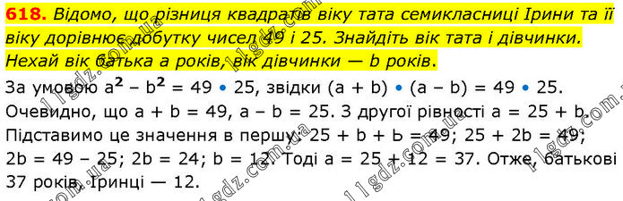 Відомо, що різниця квадратів віку тата семикласниці Ірини та її віку дорівнює добутку чисел 49 і 25. Знайдіть вік тата і дівчинки. Нехай вік батька а років, вік дівчинки — b років. За умовою а2 – b2 = 49 • 25, звідки (а + b) • (а – b) = 49 • 25. Очевидно, що а + b = 49, а – b = 25. З другої рівності а = 25 + b. Підставимо це значення в першу: 25 + b + Ь = 49; 25 + 2b = 49; 2b = 49 – 25; 2b = 24; b = 12. Тоді а = 25 + 12 = 37. Отже, батькові 37 років, Іринці — 12.