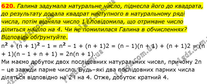 Галина задумала натуральне число, піднесла його до квадрата, до результату додала квадрат наступного в натуральному ряді числа, потім відняла число 1 і повідомила, що отримане число ділиться націло на 4. Чи не помилилася Галина в обчисленнях? Відповідь обґрунтуйте. n2 + (n + 1)2 – 1 = n2 – 1 + (n + 1)2 = (n – 1)(n + 1) + (n + 1)2 = (n + 1)(n – 1 + n + 1) = 2n(n + 1). Ми маємо добуток двох послідовних натуральних чисел, причому 2n – це завжди парне число. Будь–які два послідовних парних числа діляться відповідно на 2 і на 4. Отже, добуток кратний 4.