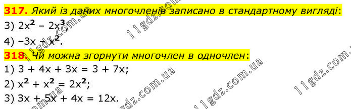 317. Який із даних многочленів записано в стандартному вигляді: 3) 2х2 – 2х3; 4) –Зх – х2. 318. Чи можна згорнути многочлен в одночлен: 1) 3 + 4х + Зх = 3 + 7х; 2) х2 + х2 = 2х2; 3) Зх + 5х + 4х = 12х.