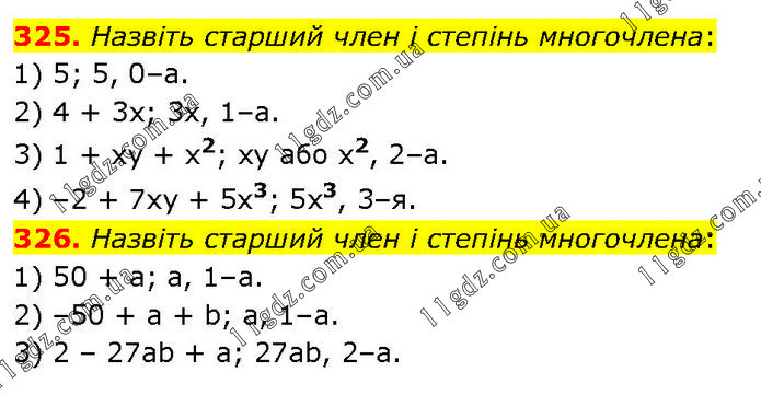 325. Назвіть старший член і степінь многочлена: 1) 5; 5, 0–а. 2) 4 + 3x; 3х, 1–а. 3) 1 + ху + x2; ху або x2, 2–а. 4) –2 + 7xy + 5x3; 5x3, 3–я. 326. Назвіть старший член і степінь многочлена: 1) 50 + а; а, 1–а. 2) –50 + а + b; а, 1–а. 3) 2 – 27аb + а; 27ab, 2–а.