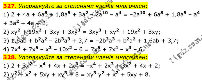 327. Упорядкуйте за степенями членів многочлен: 1) 2 + 4а + 6а8 + 1,8а5 + За2 – 2а10 – а4 = –2а10 + 6а8 + 1,8а5 – а4 + За2 + 4а + 2; 2) ху2 + 19х2 + Зху + 3xy3 = 3xy3 + ху2 + 19х2 + Зху; 3) 1,6аb + b2а2 – 2b3а3 + 3,7 = –2b3а3 + b2а2 + 1,6аb + 3,7; 4) 7x4 + 7x5 – x3 – 10x2 – 6 = 7x5 + 7x4 – x3 – 6. 328. Упорядкуйте за степенями членів многочлен: 1) 2 + Зх2 – х4 + 4х + 2х3 = –х4 + 2х3 + Зх2 + 4х + 2; 2) у2 + х2 + 5ху + ху3 + 8 = ху3 у2 + х2 + 5ху + 8.