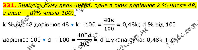 Знайдіть суму двох чисел, одне з яких дорівнює k % числа 48, а інше — d % числа 100. k % від 48 дорівнює 48 • k : 100 = 48k/100 = 0,48k; d % від 100 дорівнює 100 • d : 100 = 100d/100 = d Шукана сума: 0,48k + d.