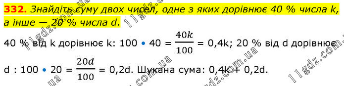 Знайдіть суму двох чисел, одне з яких дорівнює 40 % числа k, а інше — 20 % числа d. 40 % від k дорівнює k: 100 • 40 = 40k/100 = 0,4k; 20 % від d дорівнює d : 100 • 20 = 20d/100 = 0,2d. Шукана сума: 0,4k + 0,2d.