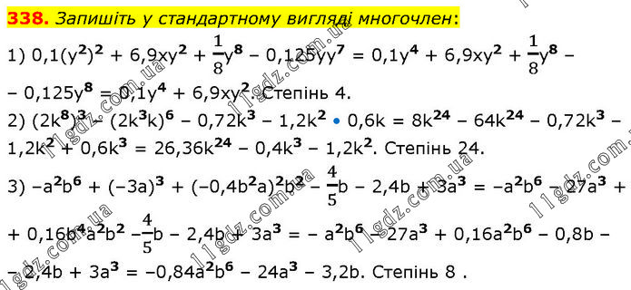 Запишіть у стандартному вигляді многочлен: 1) 0,1(y2)2 + 6,9xy2 + 1/8y8 – 0,125yу7 = 0,1y4 + 6,9xy2 + 1/8у8 – – 0,125y8 = 0,1y4 + 6,9ху2. Степінь 4. 2) (2k8)3 – (2k3k)6 – 0,72k3 – 1,2k2 • 0,6k = 8k24 – 64k24 – 0,72k3 – 1,2k2 + 0,6k3 = 26,36k24 – 0,4k3 – 1,2k2. Степінь 24. 3) –a2b6 + (–3a)3 + (–0,4b2a)2b2 – 4/5b – 2,4b + 3a3 = –a2b6 – 27a3 + + 0,16b4a2b2 –4/5b – 2,4b + 3a3 = – a2b6 – 27a3 + 0,16a2b6 – 0,8b – – 2,4b + 3a3 = –0,84a2b6 – 24a3 – 3,2b. Степінь 8.