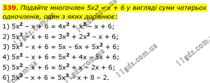Подайте многочлен 5х2 – х + 6 у вигляді суми чотирьох одночленів, один з яких дорівнює: 1) 5x2 – х + 6 = 4x2 + x2 – х + 6; 2) 5x2 – х + 6 = 3x2 + 2x2 – х + 6; 3) 5x2 – х + 6 = 5х – 6х + 5x2 + 6; 4) 5x2 – х + 6 = 5х2 + 4х – 5х + 6; 5) 5x2 – х + 6 = 5х2 + х – 2х + 6; 6) 5х2 – х + 6 = 5x2 – х + 8 – 2.