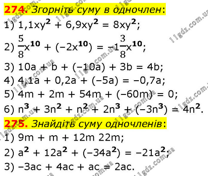 274. Згорніть суму в одночлен: 1) 1,1ху2 + 6,9ху2 = 8ху2; 2) 5/8х10 + (–2х10) = –13/8х10; 3) 10а + b + (–10а) + Зb = 4b; 4) 4,1а + 0,2а + (–5а) = –0,7a; 5) 4m + 2m + 54m + (–60m) = 0; 6) n3 + Зn2 + n2 + 2n3 + (–3n3) = 4n2. 275. Знайдіть суму одночленів: 1) 9m + m + 12m 22m; 2) а2 + 12а2 + (–34а2) = –21а2; 3) –Зас + 4ас + ас = 2ac.