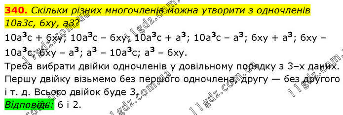 Скільки різних многочленів можна утворити з одночленів 10a3с, 6ху, а3? 10a3c + 6ху; 10a3c – 6ху; 10a3c + a3; 10a3c – а3; 6xy + а3; 6ху – 10a3c; 6ху – а3; а3 – 10а3с; а3 – 6ху. Треба вибрати двійки одночленів у довільному порядку з 3–х даних. Першу двійку візьмемо без першого одночлена, другу — без другого і т. д. Всього двійок буде 3. Відповідь: 6 і 2.