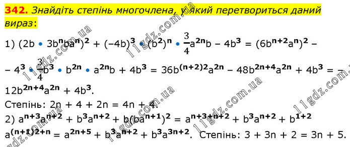 Знайдіть степінь многочлена, у який перетвориться даний вираз: 1) (2b • 3bnban)2 + (–4b)3 • (b2)n • 3/4a2nb – 4b3 = (6bn+2an)2 – – 43 • 3/4b3 • b2n • а2nb + 4b3 = 36b(n+2)2a2n – 48b2n+4а2n + 4b3 = –12b2n+4a2n + 4b3. Степінь: 2n + 4 + 2n = 4n + 4. 2) аn+3аn+2 + b3an+2 + b(ban+1)2 = аn+3+n+2 + b3an+2 + b1+2 a(n+1)2+n = а2n+5 + b3an+2 + b3а3n+2. Степінь: 3 + Зn + 2 = Зn + 5.