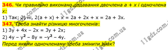 346. Чи правильно виконано додавання двочлена а + х і одночлена х: 1) Так; 2) ні, 2(а + х) + х = 2а + 2х + х = 2а + 3х. 347. Треба знайти різницю многочленів: 1) Зу + 4х – 2х = 3у + 2х; 2) 4у – у2 – 8у = –у2 – 4у. Перед якими одночленами треба змінити знак?