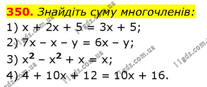 Знайдіть суму многочленів: 1) х + 2х + 5 = 3х + 5; 2) 7х – х – у = 6х – у; 3) х2 – х2 + х = х; 4) 4 + 10х + 12 = 10х + 16.