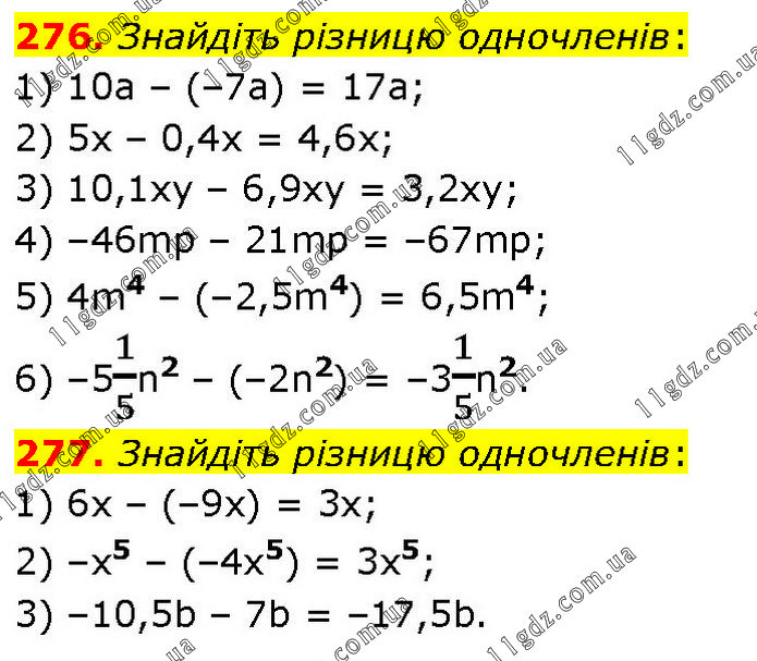 276. Знайдіть різницю одночленів: 1) 10a – (–7а) = 17a; 2) 5x – 0,4x = 4,6x; 3) 10,1ху – 6,9ху = 3,2xy; 4) –46mp – 21mр = –67mp; 5) 4m4 – (–2,5m4) = 6,5m4; 6) –51/5n2 – (–2n2) = –31/5n2. 277. Знайдіть різницю одночленів: 1) 6х – (–9х) = 3х; 2) –х5 – (–4x5) = 3x5; 3) –10,5b – 7b = –17,5b.