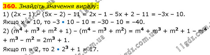 Знайдіть значення виразу: 1) (2х – 1) – (5х – 2) – 11 = 2х – 1 – 5х + 2 – 11 = –3х – 10. Якщо х = 10, то –3 • 10 – 10 = –30 – 10 = –40. 2) (m4 + m3 + m2 + 1) – (m4 – m3 + m2) = m4 + m3 + m2 + 1 – m4 + m3 – m2 = 2m3 + 1. Якщо m = 2, то 2 • 23 + 1 = 17.
