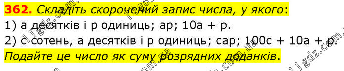 Складіть скорочений запис числа, у якого: 1) а десятків і р одиниць; ap; 10a + p. 2) с сотень, а десятків і р одиниць; cap; 100c + 10a + p. Подайте це число як суму розрядних доданків.