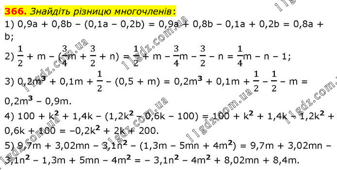 Знайдіть різницю многочленів: 1) 0,9a + 0,8b – (0,1a – 0,2b) = 0,9a + 0,8b – 0,1a + 0,2b = 0,8a + b; 2) 1/2 + m – (3/4m + 3/2 + n) = 1/2 + m – 3/4m – 3/2 – n = 1/4m – n – 1; 3) 0,2m3 + 0,1m + 1/2 – (0,5 + m) = 0,2m3 + 0,1m + 1/2 – 1/2 – m = 0,2m3 – 0,9m. 4) 100 + k2 + 1,4k – (1,2k2 – 0,6k – 100) = 100 + k2 + 1,4k – 1,2k2 + 0,6k + 100 = –0,2k2 + 2k + 200. 5) 9,7m + 3,02mn – 3,1n2 – (1,3m – 5mn + 4m2) = 9,7m + 3,02mn – 3,1n2 – 1,3m + 5mn – 4m2 = – 3,1n2 – 4m2 + 8,02mn + 8,4m.