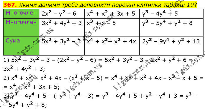 Якими даними треба доповнити порожні клітинки таблиці 19? 1) 5х2 + 3y2 – 3 – (2х2 – у2 – 6) = 5х2 + 3у2 – 3 – 2х2 + у2 + 6 = 3x2 + 4у2 + 3; 2) x4 + x3 + x2 + 4x – (x3 + х – 5) = x4 + x3 + x2 + 4х – x3 – х + 5 = = x4 + x2 + 3x + 5; 3) у3 – 4y4 + 5 – (–у2 + у4 – 3) = у3 – 4y4 + 5 + y2 – y4 + 3 = у3 – – 5y4 + y2 + 8;