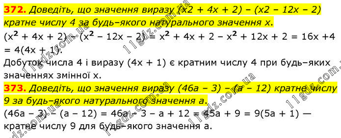 372. Доведіть, що значення виразу (х2 + 4х + 2) – (х2 – 12х – 2) кратне числу 4 за будь–якого натурального значення х. (x2 + 4х + 2) – (х2 – 12x – 2) = x2 + 4x + 2 – x2 + 12x + 2 = 16x +4 = 4(4x + 1). Добуток числа 4 і виразу (4x + 1) є кратним числу 4 при будь–яких значеннях змінної x. 373. Доведіть, що значення виразу (46а – 3) – (а – 12) кратне числу 9 за будь–якого натурального значення а. (46а – 3) – (а – 12) = 46а – 3 – а + 12 = 45а + 9 = 9(5а + 1) — кратне числу 9 для будь–якого значення а.