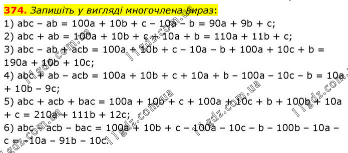 Запишіть у вигляді многочлена вираз: 1) abc – ab = 100a + 10b + c – 10a – b = 90a + 9b + c; 2) abc + ab = 100a + 10b + c + 10a + b = 110a + 11b + c; 3) abc – ab + acb = 100a + 10b + c – 10a – b + 100a + 10c + b = 190a + 10b + 10c; 4) abc + ab – acb = 100a + 10b + c + 10a + b – 100a – 10c – b = 10a + 10b – 9c; 5) abc + acb + bас = 100a + 10b + c + 100a + 10c + b + 100b + 10a + c = 210a + 111b + 12c; 6) abc – acb – bас = 100a + 10b + c – 100a – 10c – b – 100b – 10a – c = –10a – 91b – 10c.