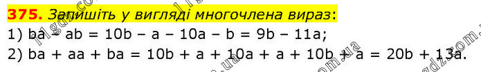 Запишіть у вигляді многочлена вираз: 1) ba – ab = 10b – a – 10a – b = 9b – 11a; 2) ba + аа + bа = 10b + a + 10a + a + 10b + a = 20b + 13a.