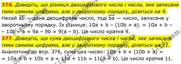 376. Доведіть, що різниця двоцифрового числа і числа, яке записане тими самими цифрами, але у зворотному порядку, ділиться на 9. Нехай ab — дане двоцифрове число, тоді ba — число, записане у зворотньому порядку. Їх різниця: 10a + b – (10b + а). = 10a + b – – 10b – а = 9а – 9b = 9(а – b). Це число кратне 9. 377. Доведіть, що сума двоцифрового числа і числа, яке записане тими самими цифрами, але у зворотному порядку, ділиться на 11. Аналогічно до впр. 376, сума цих чисел: 10a + b + (10b + а) = 10a + b + 10b + а = 11a + 11b = 11(а + b). Це число кратне 11.