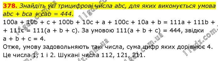 Знайдіть усі трицифрові числа abc, для яких виконується умова abc + bca + cab = 444. 100а + 10b + с + 100b + 10с + а + 100с + 10а + b = 111а + 111b + + 111c = 111(а + b + с). За умовою 111(а + b + с) = 444, звідки а + b + с = 4. Отже, умову задовольняють такі числа, сума цифр яких дорівнює 4. Це числа 1, 1 і 2. Шукані числа 112, 121, 211.