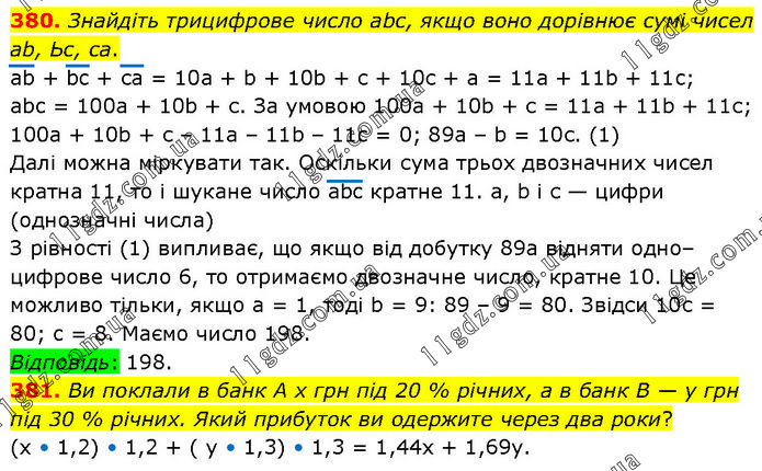 380. Знайдіть трицифрове число abc, якщо воно дорівнює сумі чисел ab, Ьс, са. ab + bc + са = 10a + b + 10b + с + 10с + a = 11a + 11b + 11c; abc = 100a + 10b + с. За умовою 100a + 10b + с = 11a + 11b + 11с; 100a + 10b + с – 11a – 11b – 11c = 0; 89а – b = 10с. (1) Далі можна міркувати так. Оскільки сума трьох двозначних чисел кратна 11, то і шукане число abc кратне 11. а, b і с — цифри (однозначні числа) З рівності (1) випливає, що якщо від добутку 89а відняти одно–цифрове число 6, то отримаємо двозначне число, кратне 10. Це можливо тільки, якщо a = 1, тоді b = 9: 89 – 9 = 80. Звідси 10с = 80; c = 8. Маємо число 198. Відповідь: 198. 381. Ви поклали в банк А х грн під 20 % річних, а в банк В — у грн під 30 % річних. Який прибуток ви одержите через два роки? (х • 1,2) • 1,2 + ( у • 1,3) • 1,3 = 1,44x + 1,69у.
