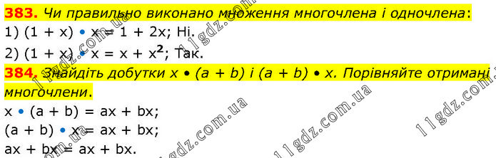 383. Чи правильно виконано множення многочлена і одночлена: 1) (1 + х) • х = 1 + 2х; Ні. 2) (1 + х) • х = х + х2; Так. 384. Знайдіть добутки х • (а + b) і (а + b) • х. Порівняйте отримані многочлени. x • (a + b) = ax + bx; (a + b) • x = ax + bx; ax + bx = ax + bx.