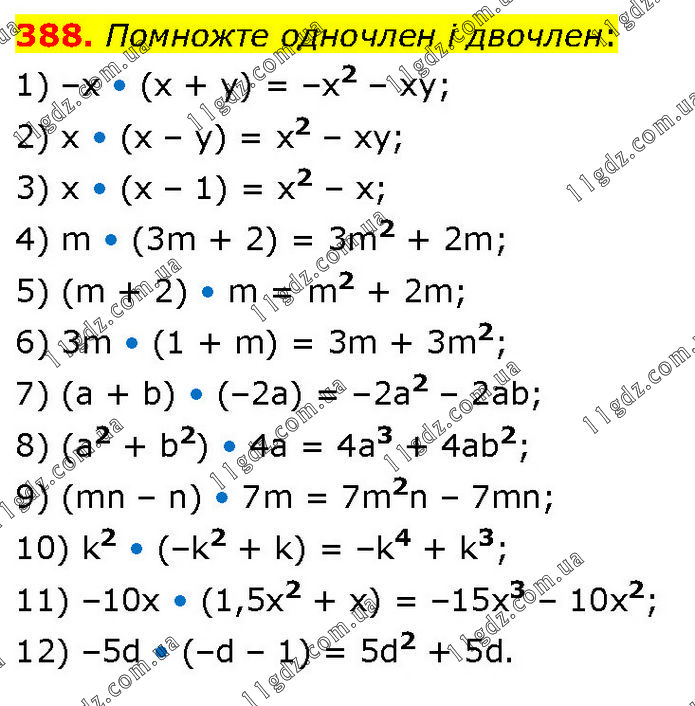 Помножте одночлен і двочлен: 1) –х • (х + у) = –x2 – xy; 2) х • (х – у) = x2 – xy; 3) х • (х – 1) = x2 – x; 4) m • (3m + 2) = 3m2 + 2m; 5) (m + 2) • m = m2 + 2m; 6) 3m • (1 + m) = 3m + 3m2; 7) (а + b) • (–2а) = –2a2 – 2ab; 8) (а2 + b2) • 4а = 4a3 + 4ab2; 9) (mn – n) • 7m = 7m2n – 7mn; 10) k2 • (–k2 + k) = –k4 + k3; 11) –10x • (1,5x2 + х) = –15x3 – 10x2; 12) –5d • (–d – 1) = 5d2 + 5d.