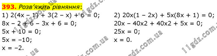 Розв’яжіть рівняння: 1) 2(4х – 1) + 3(2 – х) + 6 = 0; 8х – 2 + 6 – 3х + 6 = 0; 5х + 10 = 0; 5х = –10; х = –2. 2) 20х(1 – 2х) + 5х(8х + 1) = 0; 20х – 40х2 + 40х2 + 5х = 0; 25х = 0; х = 0.