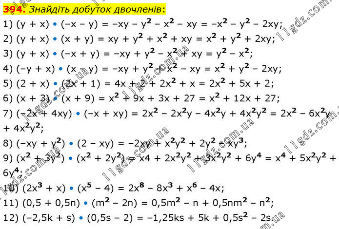 Знайдіть добуток двочленів: 1) (у + х) • (–х – у) = –xy – y2 – x2 – xy = –x2 – y2 – 2xy; 2) (у + х) • (х + у) = xy + y2 + x2 + xy = x2 + y2 + 2xy; 3) (у + х) • (–х + у) = –xy + y2 – x2 + xy = y2 – x2; 4) (–у + х) • (х – у) = –xy + y2 + x2 – xy = x2 + y2 – 2xy; 5) (2 + х) • (2х + 1) = 4x + 2 + 2x2 + x = 2x2 + 5x + 2; 6) (х + 3) • (х + 9) = x2 + 9x + 3x + 27 = x2 + 12x + 27; 7) (–2х + 4ху) • (–х + ху) = 2x2 – 2x2y – 4x2y + 4x2y2 = 2x2 – 6x2y + 4x2y2; 8) (–ху + у2) • (2 – ху) = –2xy + x2y2 + 2y2 – xy3; 9) (х2 + 3у2) • (х2 + 2у2) = x4 + 2x2y2 + 3x2y2 + 6y4 = x4 + 5x2y2 + 6y4; 10) (2х3 + х) • (х5 – 4) = 2x8 – 8x3 + x6 – 4x; 11) (0,5 + 0,5n) • (m2 – 2n) = 0,5m2 – n + 0,5nm2 – n2; 12) (–2,5k + s) • (0,5s – 2) = –1,25ks + 5k + 0,5s2 – 2s.