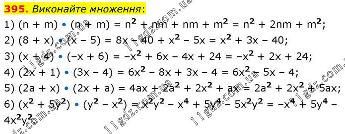 Виконайте множення: 1) (n + m) • (n + m) = n2 + nm + nm + m2 = n2 + 2nm + m2; 2) (8 + x) • (x – 5) = 8x – 40 + x2 – 5x = x2 + 3x – 40; 3) (x + 4) • (–x + 6) = –x2 + 6x – 4x + 24 = –x2 + 2x + 24; 4) (2x + 1) • (Зx – 4) = 6x2 – 8x + 3x – 4 = 6x2 – 5x – 4; 5) (2а + х) • (2x + а) = 4ax + 2a2 + 2x2 + ax = 2a2 + 2x2 + 5ax; 6) (x2 + 5y2) • (у2 – х2) = x2y2 – x4 + 5y4 – 5x2y2 = –x4 + 5y4 – 4x2y2.