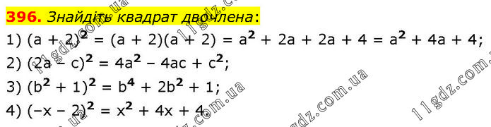 Знайдіть квадрат двочлена: 1) (а + 2)2 = (a + 2)(a + 2) = a2 + 2a + 2a + 4 = a2 + 4a + 4; 2) (2а – с)2 = 4a2 – 4ac + c2; 3) (b2 + 1)2 = b4 + 2b2 + 1; 4) (–x – 2)2 = x2 + 4x + 4.
