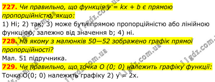 727. Чи правильно, що функція y = kx + b є прямою пропорційністю, якщо: 1) Ні; 2) так; 3) може бути прямою пропорційністю або лінійною функцією, залежно від значення b; 4) ні. 728. На якому з малюнків 50—52 зображено графік прямої пропорційності? Мал. 51 підручника. 729. Чи правильно, що точка O (0; 0) належить графіку функції: Точка O(0; 0) належить графіку 2) у = 2х.