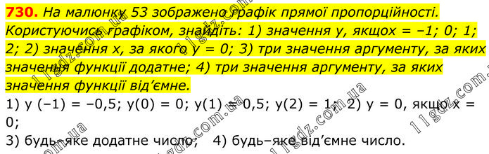 На малюнку 53 зображено графік прямої пропорційності. Користуючись графіком, знайдіть: 1) значення у, якщох = –1; 0; 1; 2; 2) значення х, за якого у = 0; 3) три значення аргументу, за яких значення функції додатне; 4) три значення аргументу, за яких значення функції від’ємне. 1) у (–1) = –0,5; у(0) = 0; у(1) = 0,5; у(2) = 1; 2) у = 0, якщо x = 0; 3) будь–яке додатне число; 4) будь–яке від’ємне число.