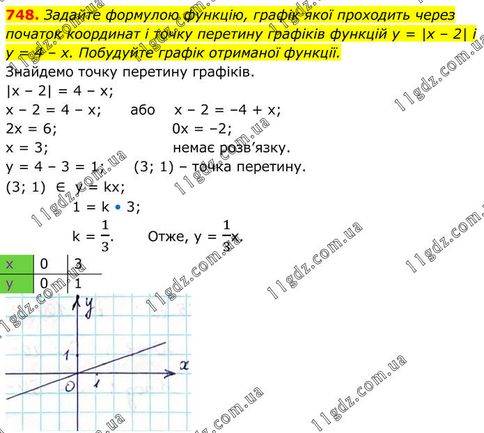 Задайте формулою функцію, графік якої проходить через початок координат і точку перетину графіків функцій у = |х – 2| і у = 4 – х. Побудуйте графік отриманої функції. Знайдемо точку перетину графіків. |x – 2| = 4 – x; x – 2 = 4 – x; або x – 2 = –4 + x; 2x = 6; 0x = –2; x = 3; немає розв’язку. у = 4 – 3 = 1; (3; 1) – точка перетину. (3; 1) ∈ y = kx; 1 = k • 3; k = 1/3. Отже, у = 1/3х.