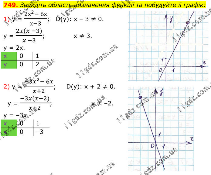 Знайдіть область визначення функції та побудуйте її графік: 1) у = (2х^2- 6х)/(х-3); D(y): x – 3 ≠ 0. y = (2x(x -3))/(x -3); x ≠ 3. y = 2x. 2) y = (-3x^2- 6x)/(x+2); D(y): x + 2 ≠ 0. y = (-3x(x+2))/(x+2); x ≠ –2. y = –3x.