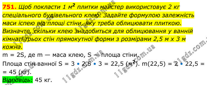 Щоб покласти 1 м2 плитки майстер використовує 2 кг спеціального будівельного клею. Задайте формулою залежність маси іспею від площі стіни, яку треба облицювати плиткою. Визначте, скільки клею знадобиться для облицювання у ванній кімнаті трьох стін прямокутної форми з розмірами 2,5 м х 3 м кожна. m = 2S, де m — маса клею, S — площа стіни. Площа стін ванної S = 3 • 2,5 • 3 = 22,5 (м2). m(22,5) = 2 • 22,5 = 45 (кг). Відповідь: 45 кг.