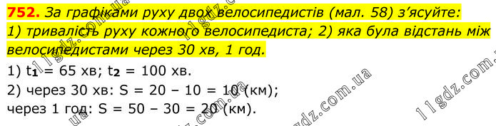 За графіками руху двох велосипедистів (мал. 58) з’ясуйте: 1) тривалість руху кожного велосипедиста; 2) яка була відстань між велосипедистами через 30 хв, 1 год. 1) t1 = 65 хв; t2 = 100 хв. 2) через 30 хв: S = 20 – 10 = 10 (км); через 1 год: S = 50 – 30 = 20 (км).