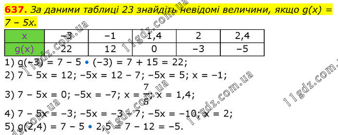 За даними таблиці 23 знайдіть невідомі величини, якщо g(x) = 7 – 5x. x –3 –1 1,4 2 2,4 g(x) 22 12 0 –3 –5 1) g(–3) = 7 – 5 • (–3) = 7 + 15 = 22; 2) 7 – 5х = 12; –5х = 12 – 7; –5х = 5; x = –1; 3) 7 – 5х = 0; –5х = –7; х = 7/5; х = 1,4; 4) 7 – 5х = –3; –5х = –3 – 7; –5х = –10; х = 2; 5) g(2,4) = 7 – 5 • 2,5 = 7 – 12 = –5.