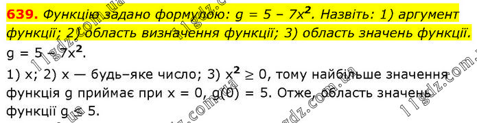 Функцію задано формулою: g = 5 – 7х2. Назвіть: 1) аргумент функції; 2) область визначення функції; 3) область значень функції. g = 5 – 7х2. 1) х; 2) х — будь–яке число; 3) х2 ≥ 0, тому найбільше значення функція g приймає при х = 0, g(0) = 5. Отже, область значень функції g ≤ 5.
